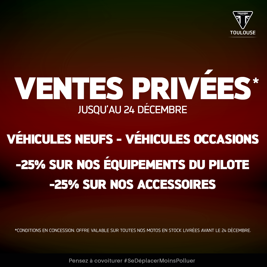 VENTES PRIVÉESJusqu'au 24 décembre, profitez chez 'Triumph Toulouse' d'une Offre Exceptionnelle sur :✅ Tous nos Modèles Neufs et Occasions.✅ -25% sur nos Accessoires / Equipements du Pilote disponibles.✅ Crédit au Taux de 1.9%* 📉